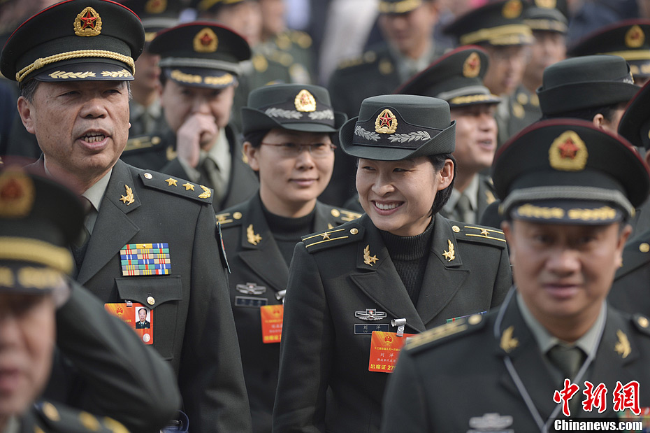 3月8日下午,第十二届全国人民代表大会第一次会议在北京人民大会堂举行第二次全体会议,全国人大常委会委员长吴邦国作全国人大常委会工作报告。图为解放军代表刘洋开心赴会。中新社发 韦亮 摄