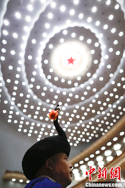 3月8日下午,第十二届全国人民代表大会第一次会议在北京人民大会堂举行第二次全体会议,全国人大常委会委员长吴邦国作全国人大常委会工作报告。图为一名彝族代表参会。中新社发 盛佳鹏 摄