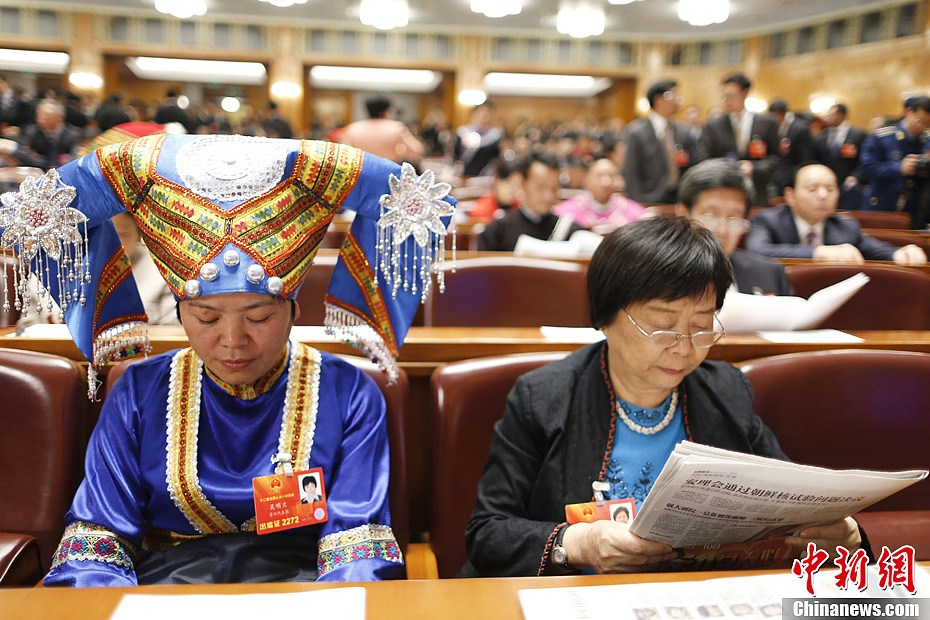 3月8日下午,第十二届全国人民代表大会第一次会议在北京人民大会堂举行第二次全体会议,全国人大常委会委员长吴邦国作全国人大常委会工作报告。图为少数民族代表听取报告。中新社发 盛佳鹏 摄