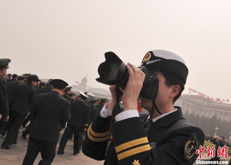 3月8日下午,第十二届全国人民代表大会第一次会议在北京人民大会堂举行第二次全体会议,海军女代表为解放军团拍照。中新社发 贾国荣 摄