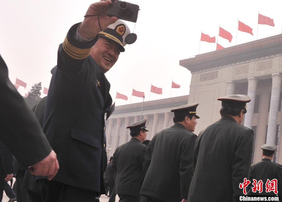 3月8日下午,第十二届全国人民代表大会第一次会议在北京人民大会堂举行第二次全体会议,解放军代表团的一位代表拿相机边拍摄边进入人民大会堂。中新社发 贾国荣 摄