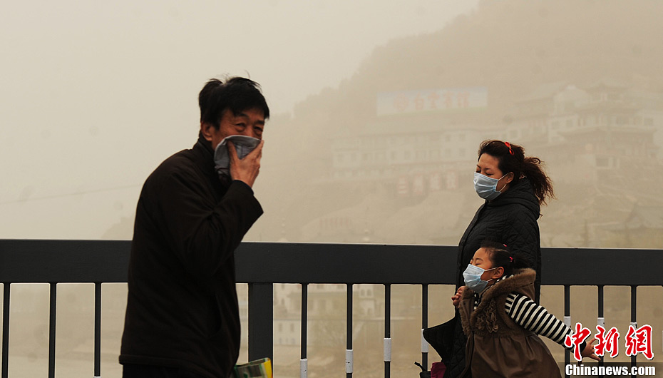3月9日,黄沙浮尘笼罩兰州,市民纷纷“全副武装”出行,浮尘中人们表情各异。中新社发 杨艳敏 摄