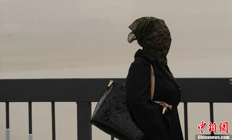 3月9日,黄沙浮尘笼罩兰州,市民纷纷“全副武装”出行。中新社发 杨艳敏 摄