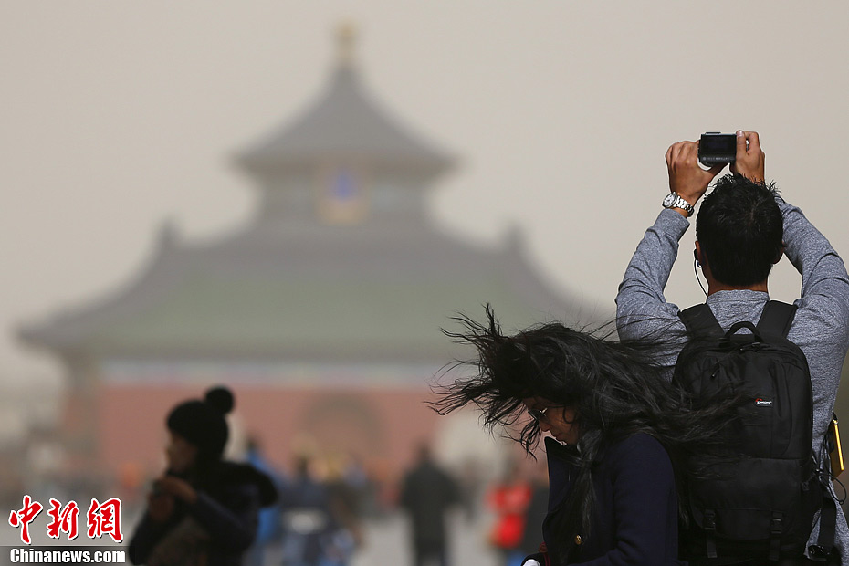 3月9日上午,游客在天坛公园内遭遇恼人的漫天扬沙。伴随着寒流狂风,从9日上午开始漫天沙尘弥漫全北京和中国北方众多区域。中新社发 富田 摄