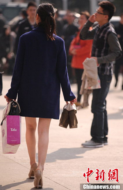 3月9日,中国东方航空江苏公司在南京面向江苏、浙江、山东、江西等省招聘空乘兼安全员,吸引了大批空乘专业的学生和具有空中乘务员和安全员飞行经历的应聘者前来。图为一位应聘者提着鞋子前来。泱波 摄