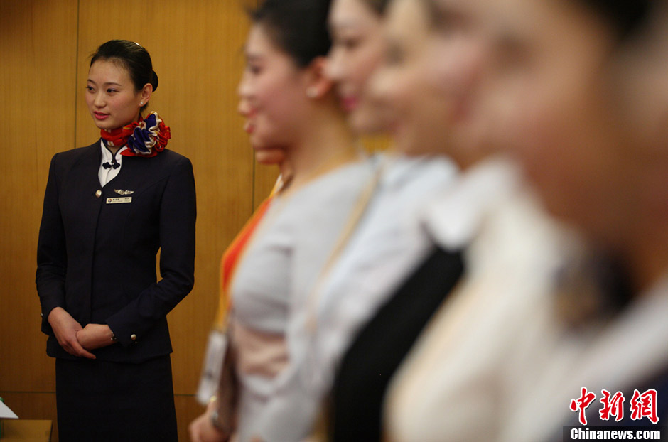 3月9日,中国东方航空江苏公司在南京面向江苏、浙江、山东、江西等省招聘空乘兼安全员,吸引了大批空乘专业的学生和具有空中乘务员和安全员飞行经历的应聘者前来。图为应聘者在参加面试环节。泱波 摄