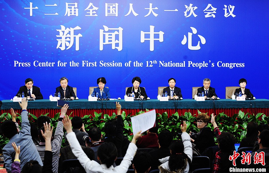 3月9日下午,十二届全国人大一次会议新闻中心举行记者会,全国人大五位负责人就“人大工作”相关问题回答了中外记者的提问。图为记者会现场。中新社发 刘忠俊 摄