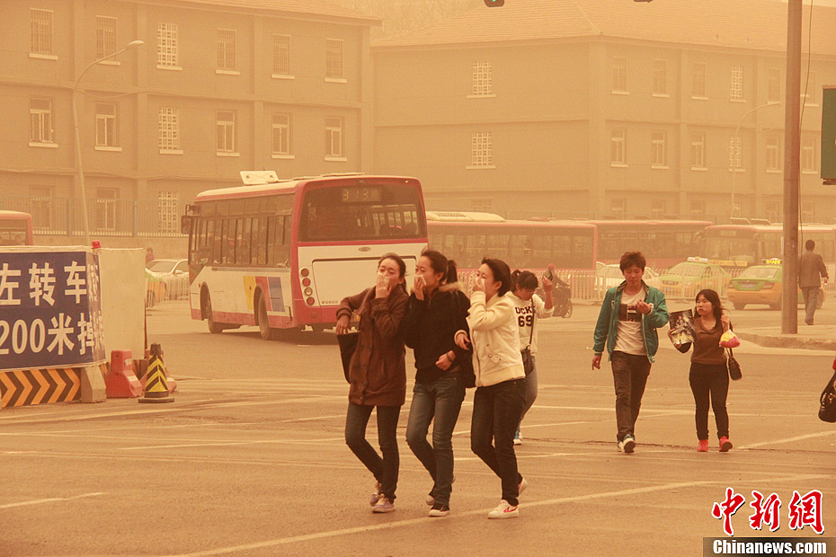 3月9日16时,西安市气象局发布沙尘暴黄色预警,西安市部分地区已出现能见度小于1000米的沙尘暴天气,预计未来12小时沙尘天气可能持续。记者在街头看到,漫天黄沙,蚀尽春色,过往市民纷纷采取遮蔽措施。图为风盈袖。冀浩凡 摄