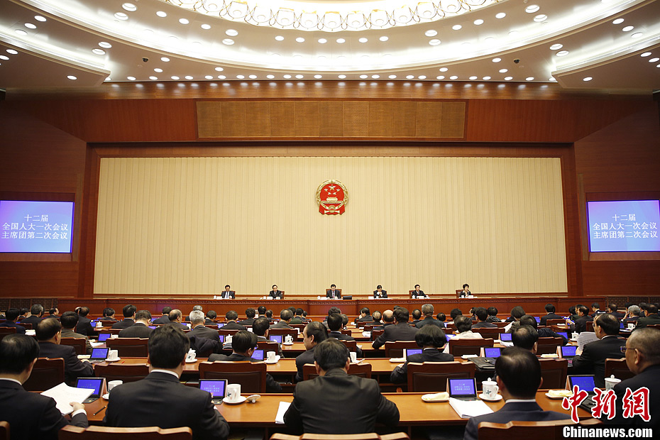 3月9日下午,十二届全国人大一次会议主席团第二次会议在北京人民大会堂举行,张德江主持会议。中新社发 盛佳鹏 摄