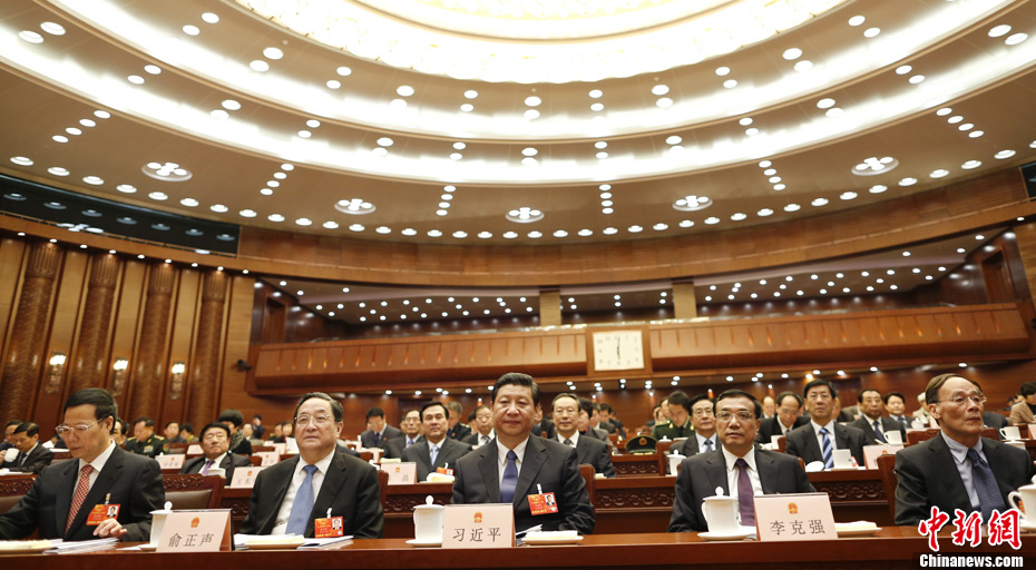3月9日下午,十二届全国人大一次会议主席团第二次会议在北京人民大会堂举行,习近平、李克强、俞正声、王岐山、张高丽参加会议。中新社发 盛佳鹏 摄