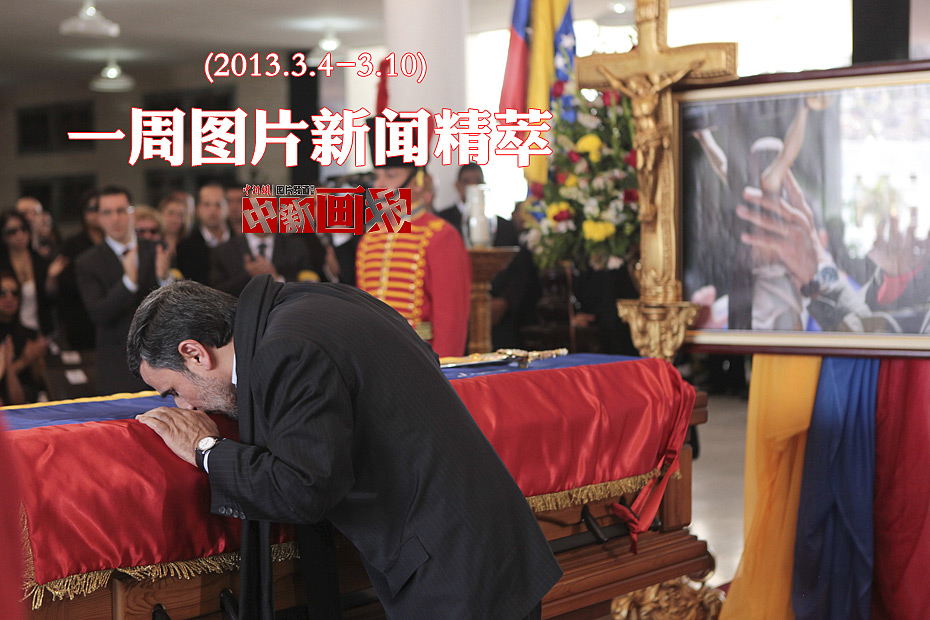 吻别:当地时间2013年3月8日,委内瑞拉加拉加斯,查韦斯国葬仪式在委内瑞拉军事学院举行,55个国家的领导人、特使团以及多个国际组织的负责人或代表参加。图为伊朗总理内贾德亲吻查韦斯棺木。