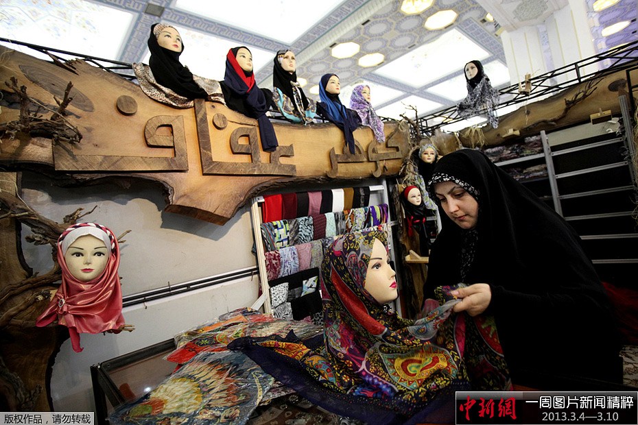 周一,伊朗德黑兰,在伊玛目霍梅尼大清真寺举办的第二届Fadjr国际时装节上,一名伊朗妇女正在给一个人体模型戴头巾。
