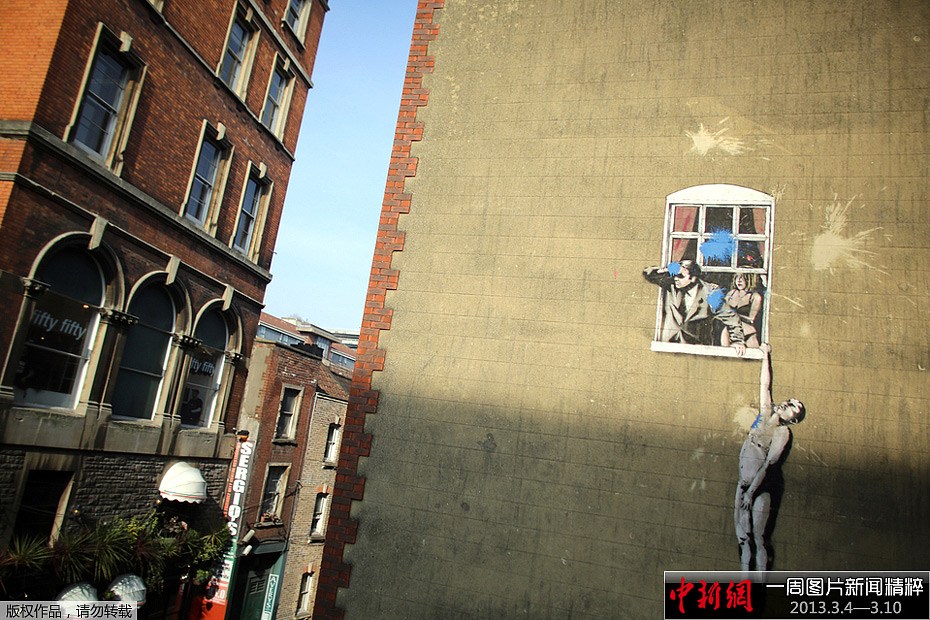 周一,英国布里斯托尔(Bristol)一座大楼的墙上,街头艺术家班克斯(Banksy)创作的壁画被喷上了蓝色涂料。二十世纪学会(Twentieth Century Society)发起了一项运动,试图抢救一些二战后该国最知名的壁画。