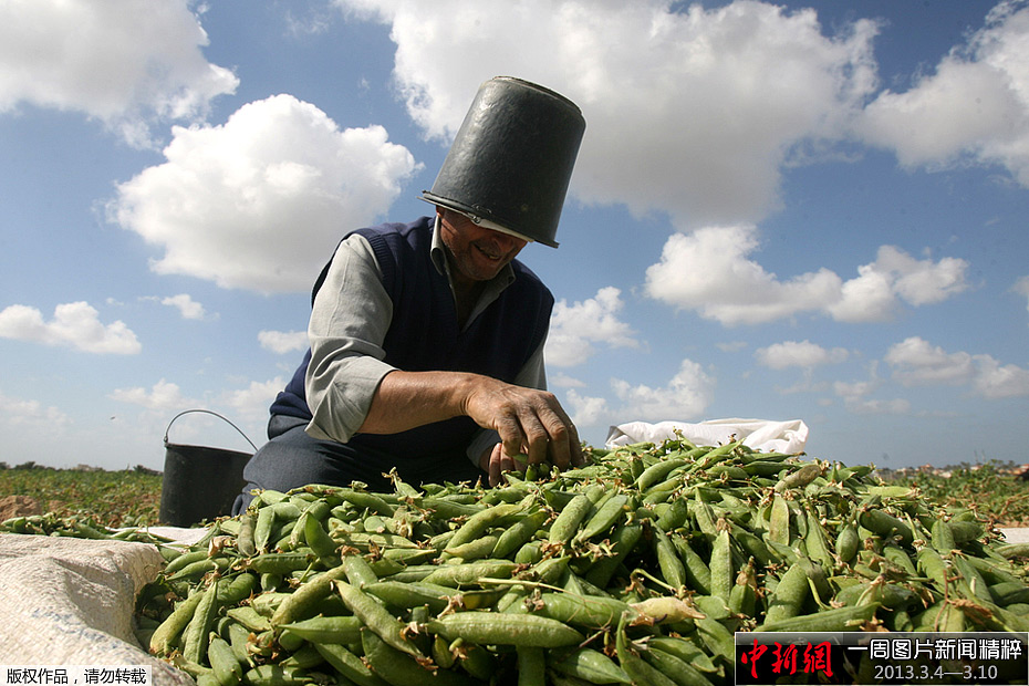 周二,加沙地带,一名巴勒斯坦农民正在收获豌豆。以色列农业部植物保护和检查署的负责人巴希特(Saleh Bakheet)说,成群的蝗虫周一晚蜂拥至加沙地带,袭击了南部地区的部分田地。
