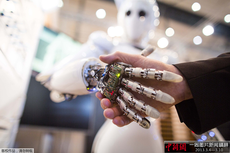 周二,在德国汉诺威举办的2013年CeBIT科技展上,一名观展游客正在和德国人工智能研究中心展位上的一个机器人握手。
