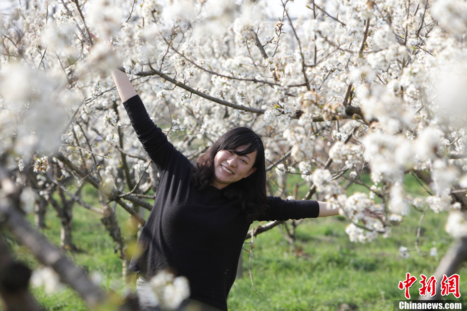 3月9日,浙江省诸暨市赵家镇万亩樱桃花盛开,游客在樱桃花丛中赏花拍照。中新社发 骆善新 摄
