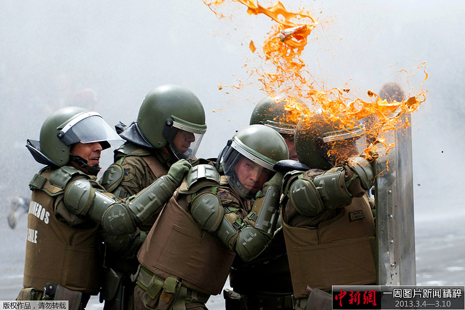 周四,智利圣地亚哥,学生们举行了抗议活动,要求总统皮涅拉(Sebastian Pinera)领导的政府改善公共教育体系,并和防暴警察发生冲突。图为冲突中,防暴警察躲在盾牌后。