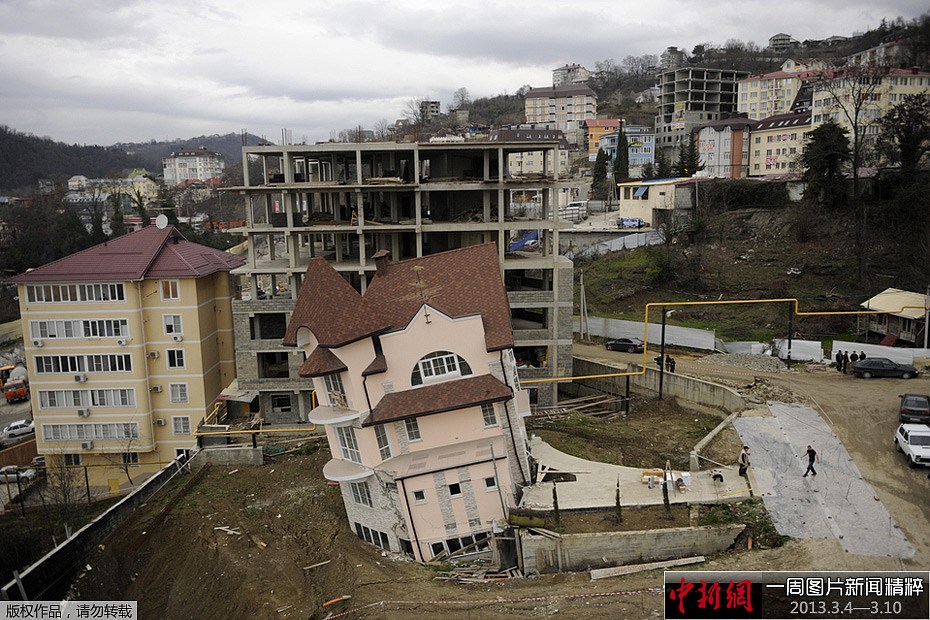 周一,俄罗斯索契(Sochi),工人们将一幢倾斜的建筑封锁起来。据当地媒体报道,附近一条正在为2014年冬奥会修建的公路隧道垮塌,这座在建的三层公寓楼随后发生倾斜。