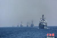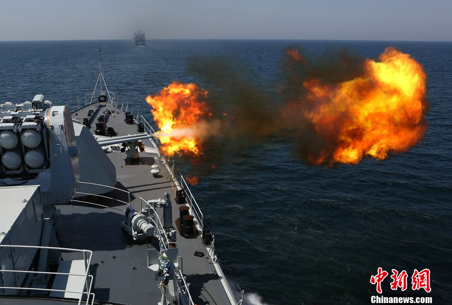3月3日至8日,由海军北海舰队参谋长袁誉柏少将率领的第十四批护航编队,在印度洋上参加了巴基斯坦倡导的“和平-13”多国海上联合演习,3艘舰艇作为主要兵力分别编入两个兵力群。14个国家24艘舰艇、25架飞机、7个国家特战队云集阿拉伯海海域,炮声阵阵、直升机轰鸣、各类小艇海上高速机动,海上实兵演练快节奏展开,科目转换频繁。演练的内容主要包括海上补给演练、主炮对海射击、海上联合搜救、灯光通信演练等21个项目,演习结束时进行了盛大的海上阅兵式。图为主炮实弹射击 。中新社发 王长松 摄