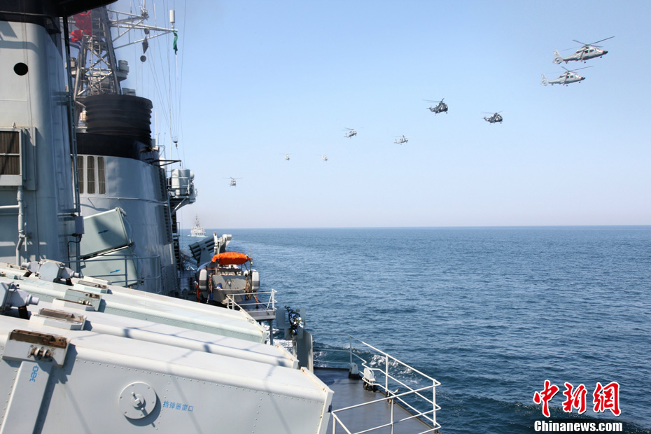 3月3日至8日,由海军北海舰队参谋长袁誉柏少将率领的第十四批护航编队,在印度洋上参加了巴基斯坦倡导的“和平-13”多国海上联合演习,3艘舰艇作为主要兵力分别编入两个兵力群。演习结束时进行了盛大的海上阅兵式。图为直升机群空中分列式 。中新社发 王长松 摄