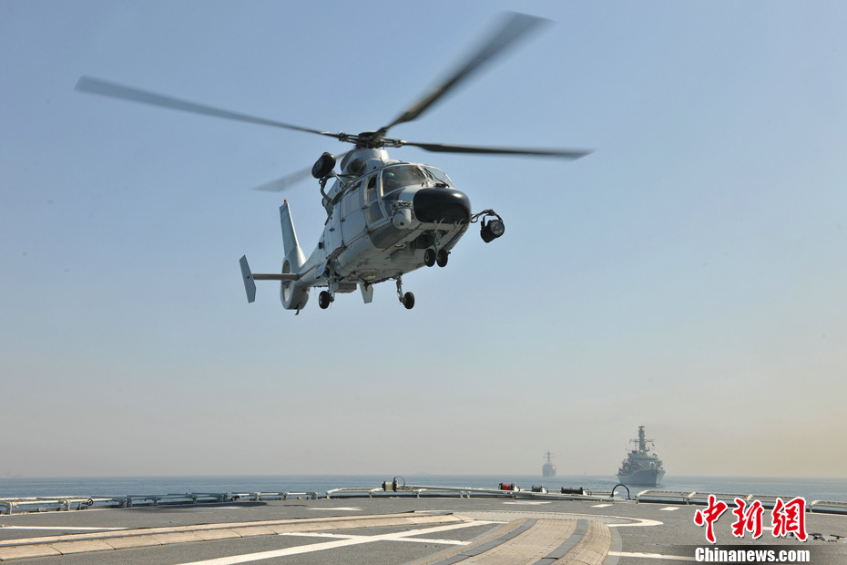3月3日至8日,由海军北海舰队参谋长袁誉柏少将率领的第十四批护航编队,在印度洋上参加了巴基斯坦倡导的“和平-13”多国海上联合演习,3艘舰艇作为主要兵力分别编入两个兵力群。演习结束时进行了盛大的海上阅兵式。图为直升机起飞参加编队飞行演练 。中新社发 王长松 摄