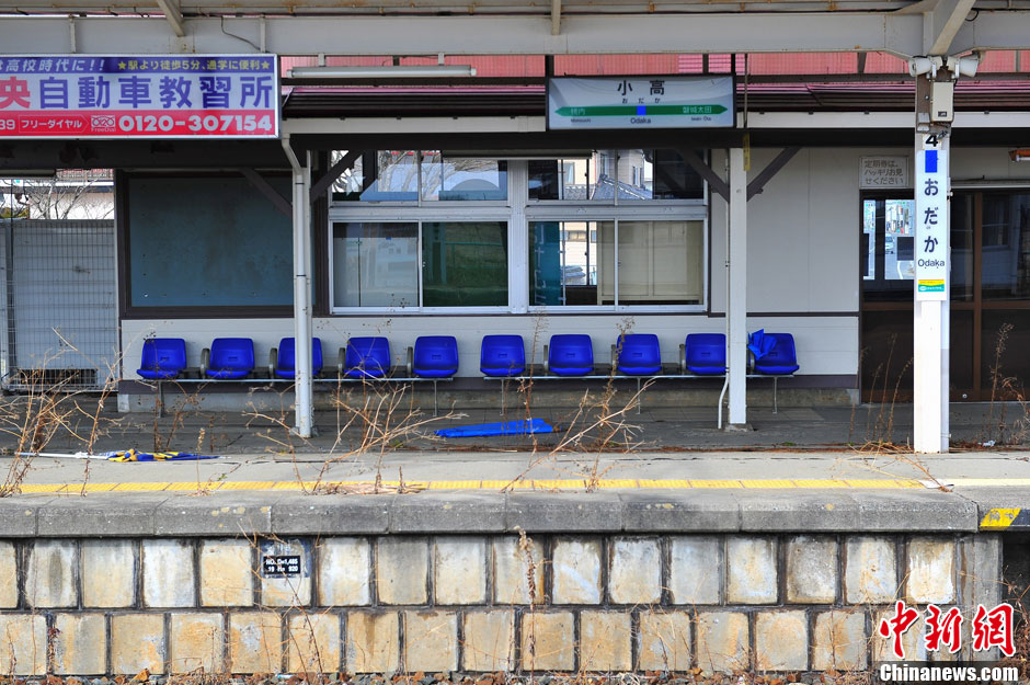 3月初,中新社记者探访旧警戒区——日本福岛县南相马市小高区,该地距离核电站15公里。记者目击该区域人烟稀少,依旧像个“鬼城”。图为小高区车站,曾是该区域的中心,目前荒草丛生。中新社发 孙冉 摄