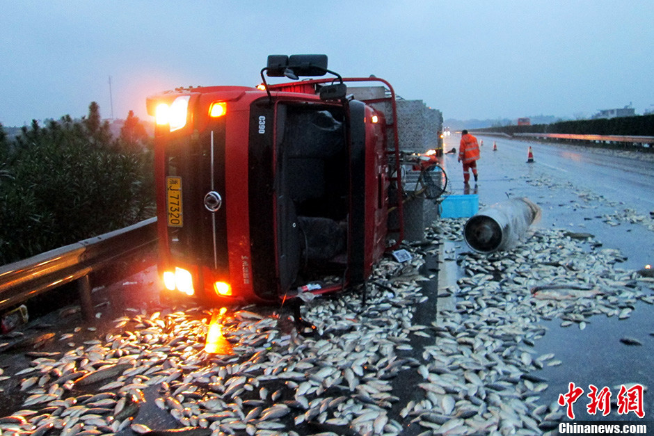 货车载9吨活鱼高速路上侧翻 遭村民哄抢