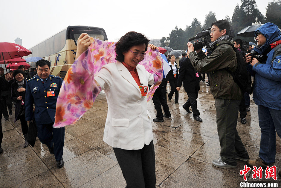 全国政协十二届一次会议雨中闭幕 委员冒雨进场