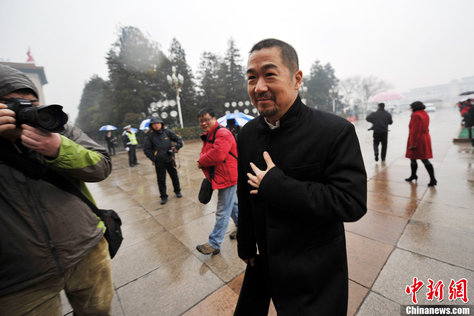 3月12日,全国政协十二届一次会议在北京人民大会堂举行闭幕大会。当日,北京迎来2013年首场降雨。图为张国立冒雨进场。中新网记者 金硕 摄