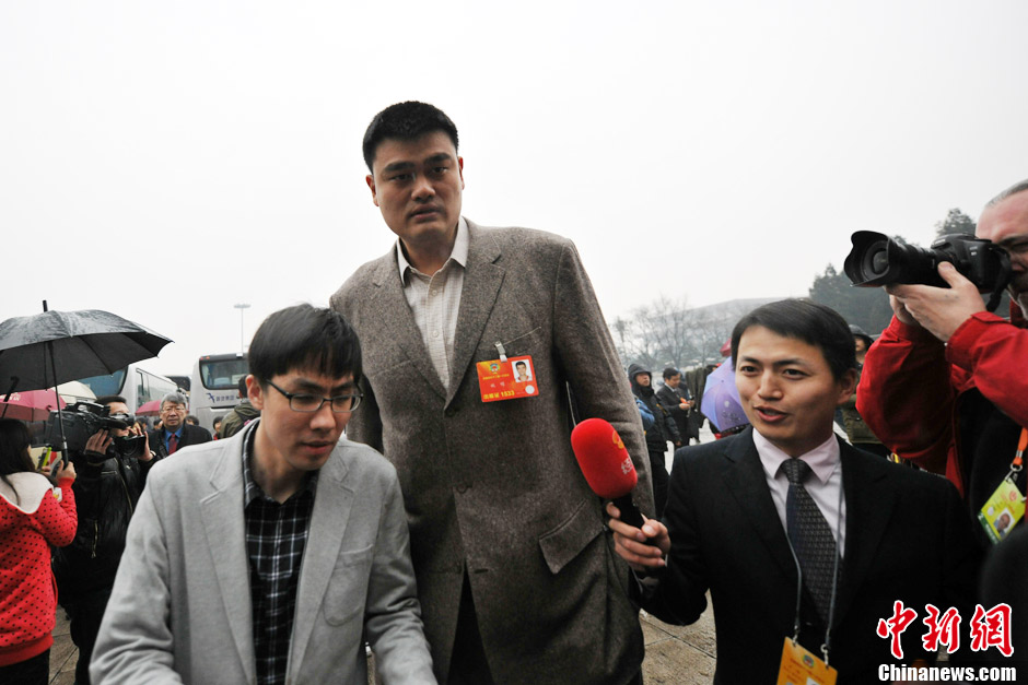3月12日,全国政协十二届一次会议在北京人民大会堂举行闭幕大会。当日,北京迎来2013年首场降雨。图为姚明冒雨进场。中新网记者 金硕 摄