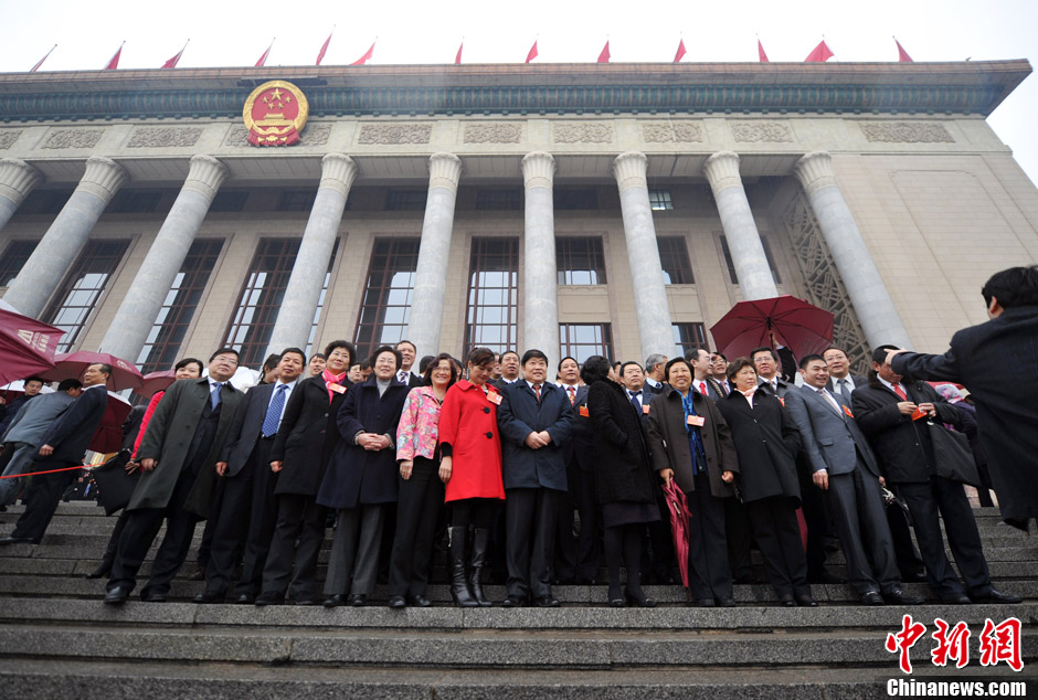 3月12日,全国政协十二届一次会议在北京人民大会堂举行闭幕大会。当日,北京迎来2013年首场降雨。图为委员雨中在人民大会堂前合影。中新网记者 金硕 摄