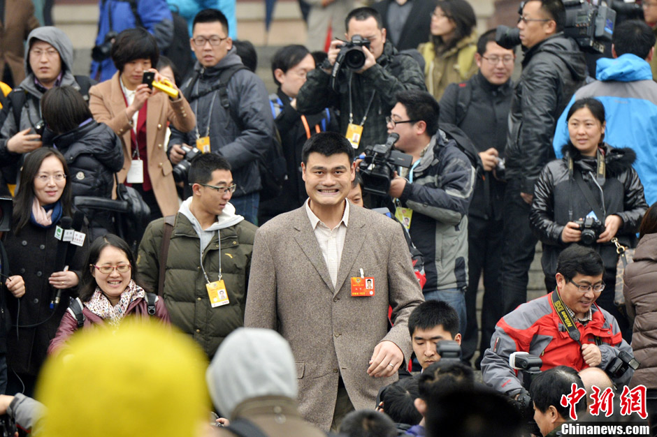3月12日上午,全国政协十二届一次会议在北京人民大会堂闭幕。图为姚明突出记者包围后露出“囧”态。中新社发 韦亮 摄