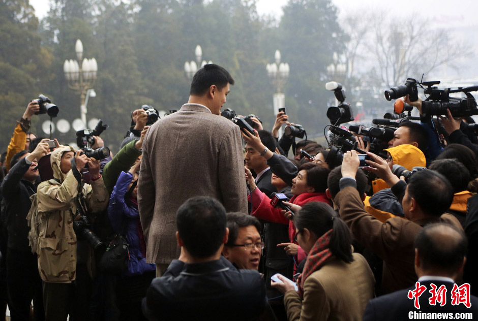 3月12日上午,全国政协十二届一次会议在北京人民大会堂闭幕。姚明会后受到媒体记者包围采访。中新社发 赵隽 摄