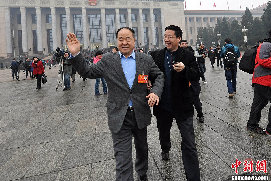 3月12日上午,全国政协十二届一次会议在北京人民大会堂闭幕。全国政协委员莫言走出会场,向记者挥手告别。中新网记者 金硕 摄