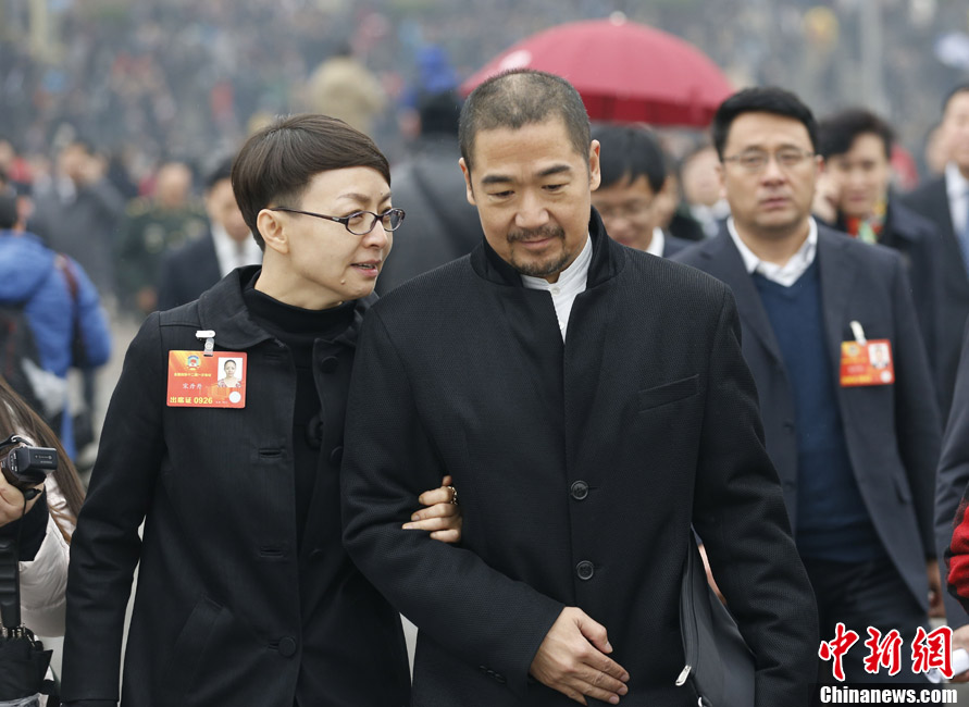 3月12日上午,全国政协十二届一次会议在北京人民大会堂闭幕。宋丹丹手挽张国立走出人民大会堂。中新社发 杜洋 摄