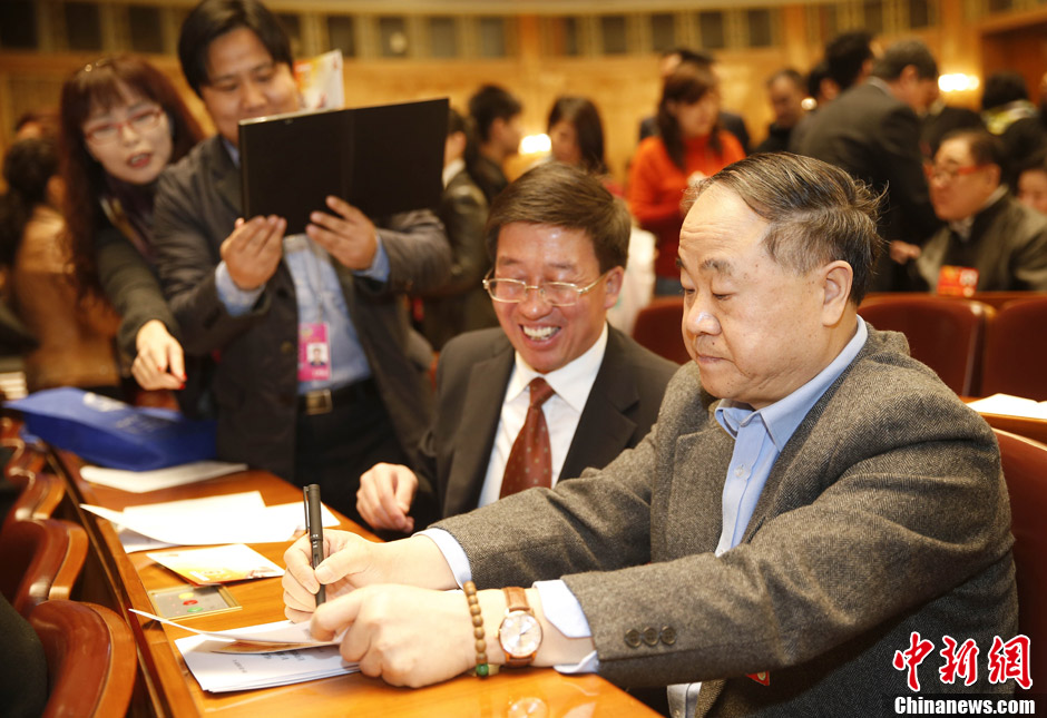 3月12日上午,全国政协十二届一次会议在北京人民大会堂闭幕。会议开始前,委员排队等待莫言签名。中新社发 盛佳鹏 摄
