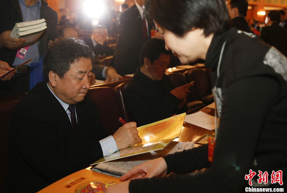 3月12日上午,全国政协十二届一次会议在北京人民大会堂闭幕。姜昆在会议开始前为委员签名。中新社发 盛佳鹏 摄