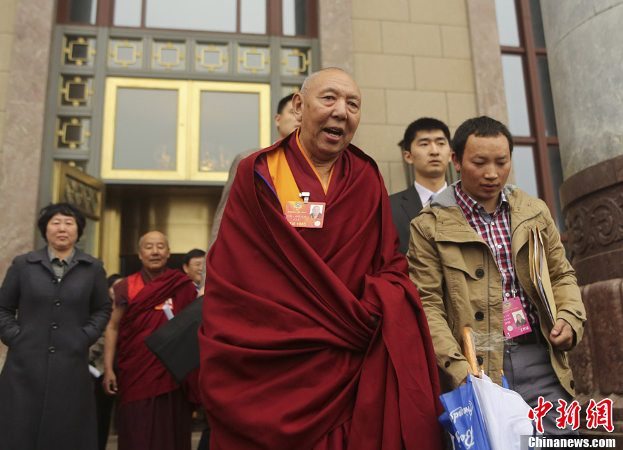 3月12日上午,全国政协十二届一次会议在北京人民大会堂闭幕。宗洛·向巴克珠委员会后走出大会堂。中新社发 赵隽 摄