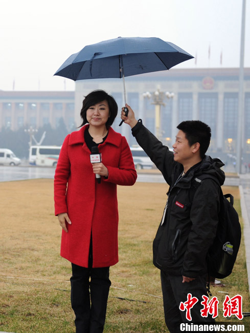 3月12日上午,全国政协十二届一次会议在北京人民大会堂闭幕。记者冒雨为主持人打伞。中新社发 刘忠俊 摄