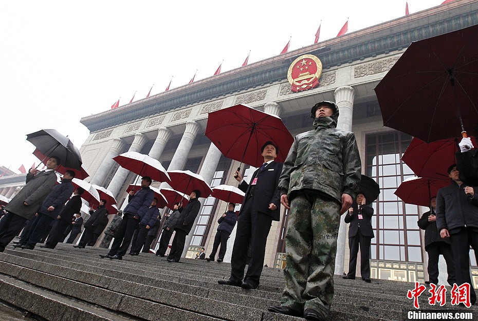 3月12日上午,全国政协十二届一次会议在北京人民大会堂闭幕。工作人员冒雨在人民大会堂前站岗。中新社发 张浩 摄