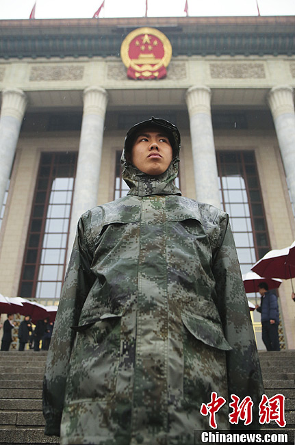 3月12日上午,全国政协十二届一次会议在北京人民大会堂闭幕。工作人员冒雨在人民大会堂前站岗。中新社发 赵隽 摄