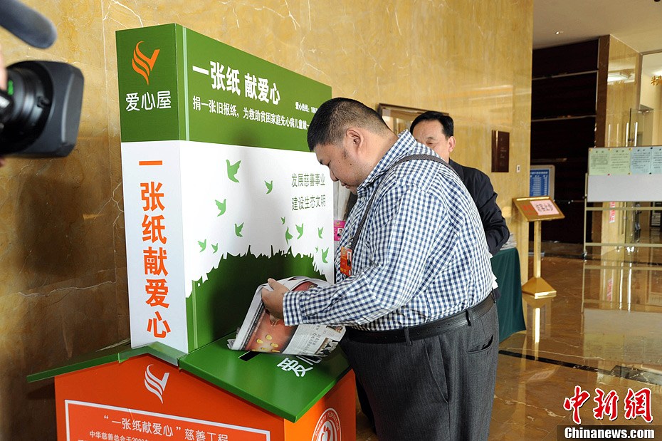 全国两会召开期间,毛新宇委员将看过的旧报纸投入驻地设置的“爱心屋”中。中华慈善总会于2008年3月启动了“一张纸献爱心”慈善工程,呼吁人们将日常生活中产生的废旧纸张捐献出来,变“废”为财,奉献爱心,救助贫困家庭先天性心脏病儿童。中新社发 杜洋 摄