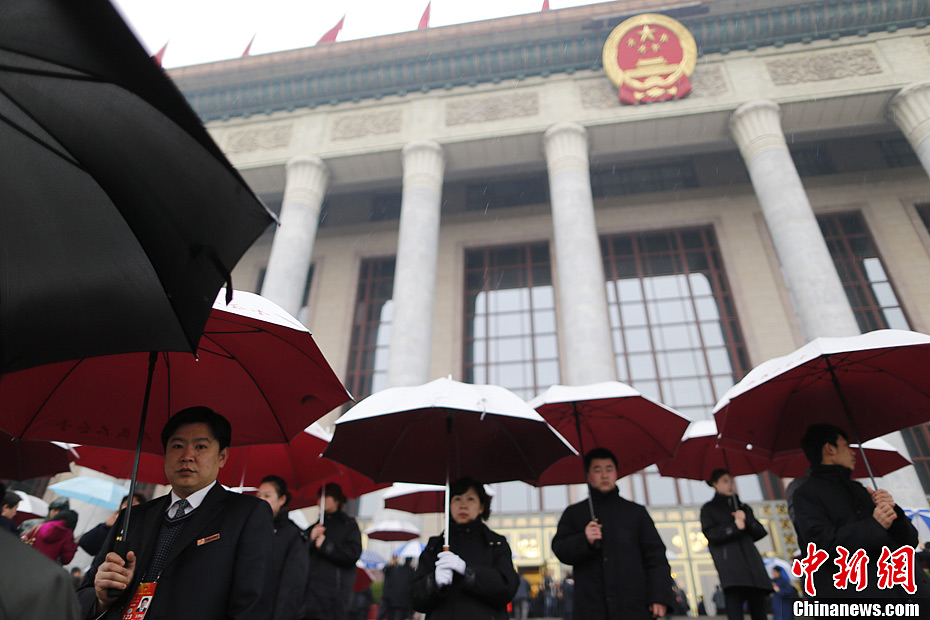 3月12日下午,全国政协十二届一次会议在北京人民大会堂闭幕。工作人员在大会堂前撑伞迎接委员。中新社发 盛佳鹏 摄