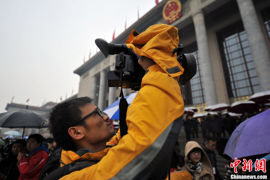 3月12日,全国政协十二届一次会议在北京人民大会堂举行闭幕大会。当日,北京迎来2013年首场降雨。图为记者雨中拍摄委员入场。中新网记者 金硕 摄