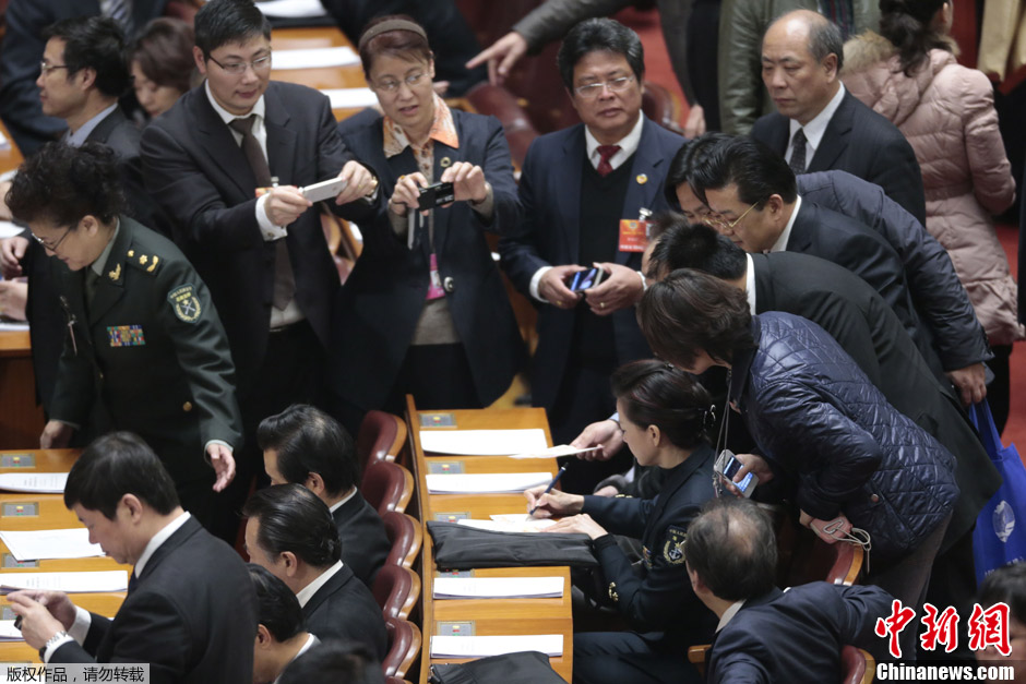 3月12日上午,全国政协十二届一次会议在北京人民大会堂闭幕。会议开始前,许多委员请宋祖英委员在纪念信封上签名。中新社发 杜洋 摄