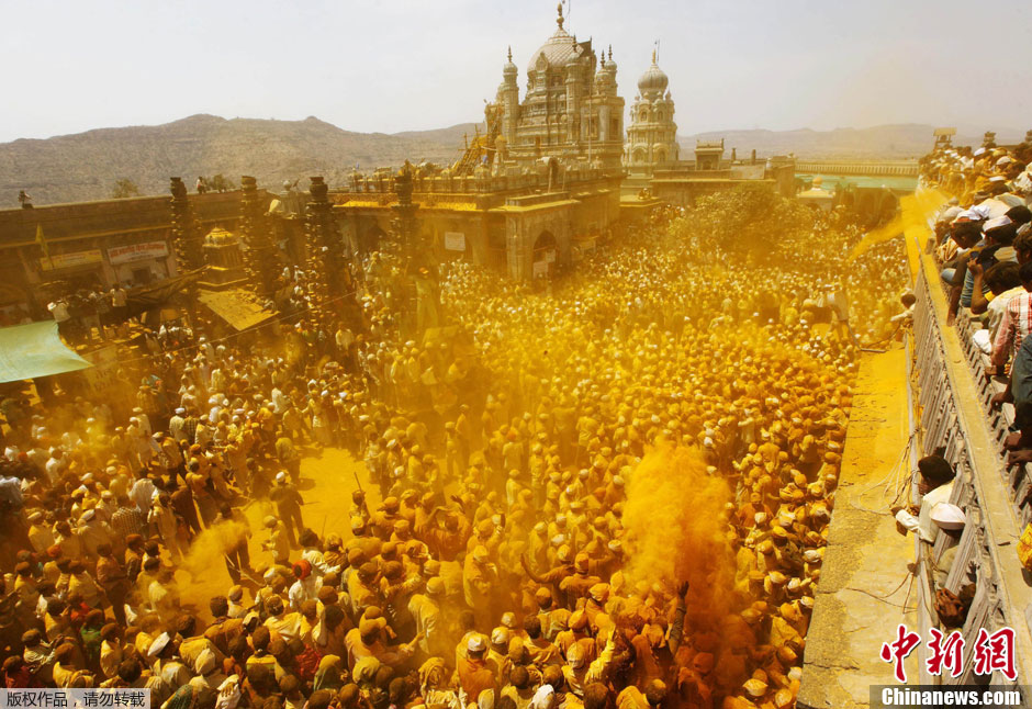 当地时间3月11日,印度马哈拉施特拉,为迎接“Somavati Amavasya”日(即正逢周一的满月之日),当地印度教教徒在街头撒黄色粉末进行庆祝。