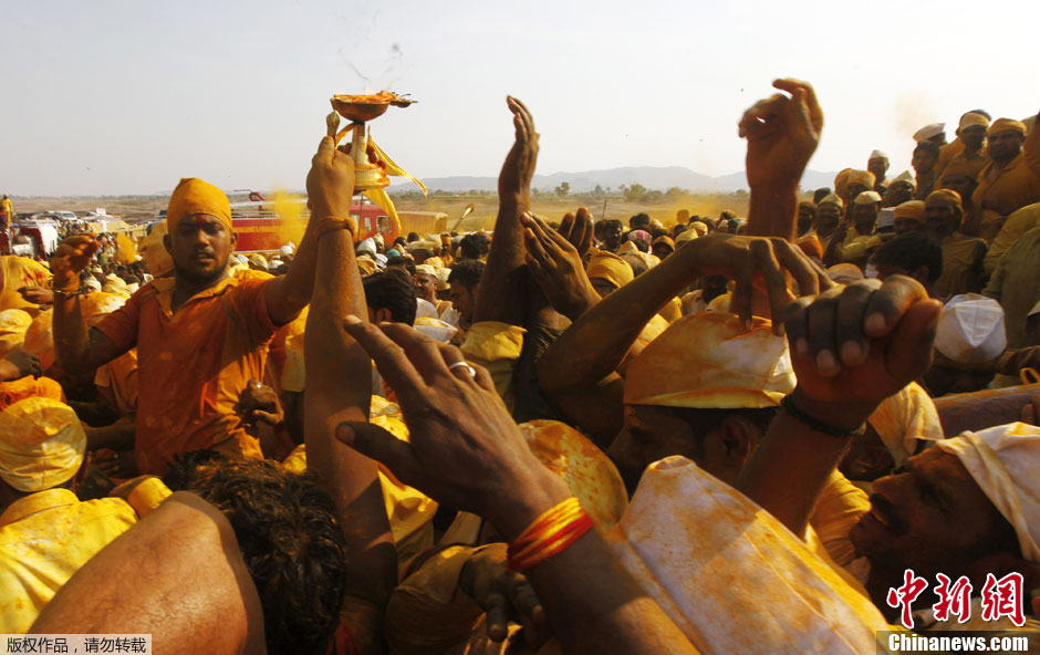 当地时间3月11日,印度马哈拉施特拉,为迎接“Somavati Amavasya”日(即正逢周一的满月之日),当地印度教教徒在街头撒黄色粉末进行庆祝。