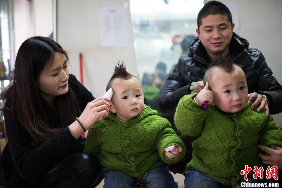 3月13日,安徽省淮北市市民带着孩子在理发店剃头。当日是农历二月初二,中国传统民俗有着“二月二、剃龙头”的习俗,民间认为这天剃头意味着新年新气象。中新社发 王璋闻 摄 图片来源:CNSPHOTO
