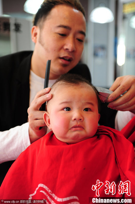 2013年03月13日是农历二月初二,中国传统民俗有着“二月二 剃龙头”的习俗,民间认为这天剃头意味着新年新气象,一定会带来好运。图为2013年03月13日,山东省烟台市,出生5个月的小朋友曲泳豪正在“剃龙头”。图片来源:CFP视觉中国