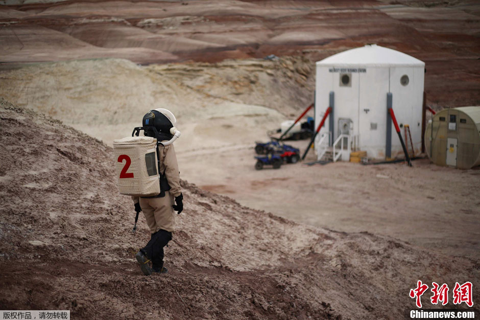 据当地时间3月11日发布的图片显示,当地时间3月2日,美国犹他州火星沙漠研究站,工作人员身穿太空服在模拟火星居留地进行采集地质样本等研究活动。